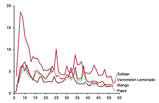 I løpet av hele 2025 legger den seg på topp 7, og er i så måte tett på bestselgerne Rullerer ikke på samme nivå som Solbær (men det skal godt gjøres), ligger likevel tett på samme nivå som Årets Smak i 2023 Source: Nielsen Unit sales 2025 Source: Nielsen ROS (Units) 2023, 2024 & 2025