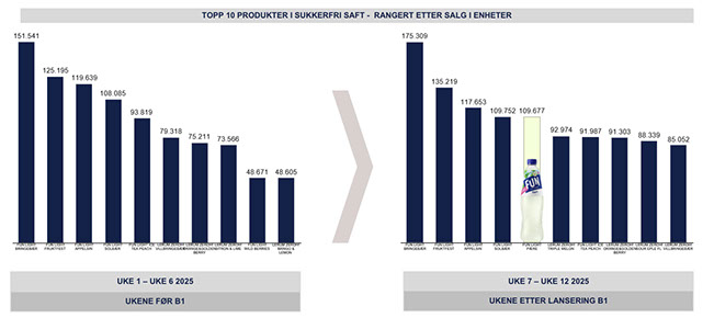 Nyheter fra FUN Light er raskt oppe på topplista innen sukkerfri saft – foran Zeroh sine! Kilde: NIQ Discover – Sales Units NTOT​  FUN Light salgsutvikling