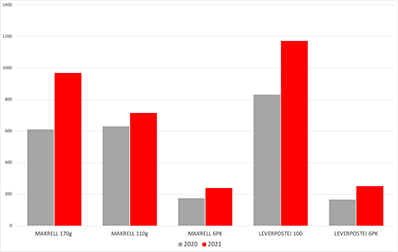 Måleparametre: NÅR: uke 32-38 (målt mot samme periode i fjor) HVOR: TORG Produkter: Makrell 170g, Makrell 110g, Leverpostei 100g, MAKRELL 6PK, LEVERPOSTEI 6PK