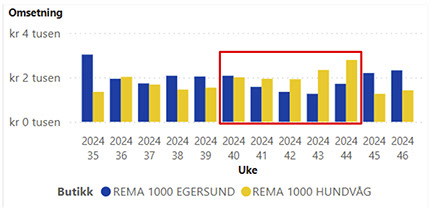 Stabbur Makrell – Eksponering ved bruk av Podie Bruk av mindre- og mer fleksible eksponeringsløsninger på Stabbur Makrell kan bidra både til flere- og bedre eksponeringer Makrellpodiet ble utviklet for å teste denne teorien Rema 1000 Hundvåg satt opp eksponeringen ved brødavdelingen torsdag uke 40, og tok den bort mandag uke 45 Normalt ligger Hundvåg bak Egersund, men i perioden hvor podiet var eksponert i brødavdelingen var Hundvåg størst = Relevante eksponeringer øker salget