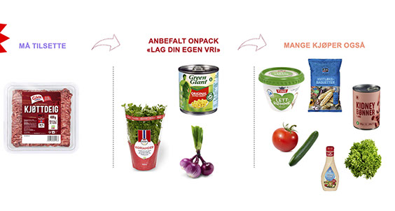 Kunden som kjøper meksikansk gryte familiepakning må også innom kjøledisken for kjøttdeig, men kan potensielt besøke opp til 6 kategorier for å få mest ut av retten