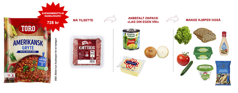 Kunden som kjøper amerikansk gryte må også innom kjøledisken for kjøttdeig, men kan potensielt besøke opp til 5 kategorier for å få mest ut av retten