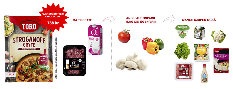 Kunden som kjøper stroganoff gryte må også innom meieri for melk og kjøledisken for kjøtt, men kan potensielt besøke opp til 5 kategorier for å få mest ut av retten