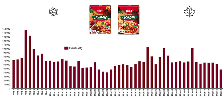 kilde: NIQ | Enhetssalg | TORO ovnsretter | Norge total | Uke for uke 2023