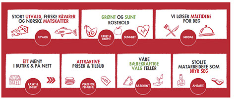 Meny sin strategi: «Vi skal hjelpe folk å spise bedre!» Meny skal ha Norges beste utvalg Unike posisjoner som Meny jobber for å rendyrke og forsterke: "Pene og trivelige butikker, plettfritt renhold, nystekte brød og bakevarer, høy kvalitet, stort vareutvalg, kjøtt og fiskedisker med hjelpsomme matarbeidere, alltid fristende helgemiddager, inspirasjon til matglede, best på nyheter og lokale matskatter" Meny ser på matarbeidere som den viktigste differensieringen i markedet