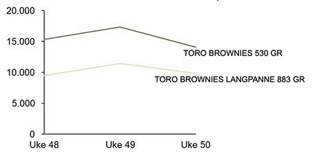 God økning i salg inn mot browniesdagen​ Kilde: NIQ | Sales units | Norge total | TORO BROWNIES 530 GR og TORO BROWNIES LANGPANNE 883 GR | Uke 48-50 2024​