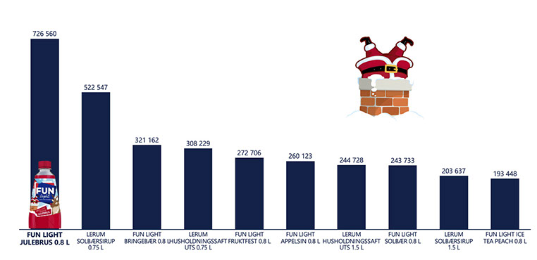 FUN Light - salgsutvikling I JUL FUN Light topper kategorien i julesesongen! Kilde: Nielsen, Konsentrert drikke Topp 10, Unit Sales, Norge totalt