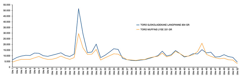 NIQ | TORO sjokoladekake langpanne og lyse muffins | Enhetssalg | Norge total | Uke for uke 2024