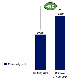 SALGET AV PICNIC LØFTER SEG I VÅR- OG SOMMERHALVÅRET NIQ | Stabburet picnic 325g | Enhetssalg | Norge total | 2024 53% HØYERE ENHETSSALG AV PICNIC I UKE 17-30 VS. SNITTSALG 2024
