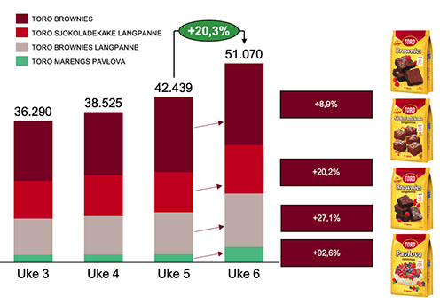 Kilde: NielsenIQ | Sales units og % change | Uke 3-6 2023 | Norge totalt DVH
