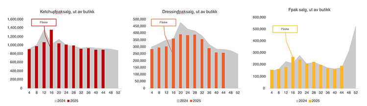 Påske er viktig sesong for både ketchup, sennep og dressing. Lykkes vi med synlighet her vil det utvilsomt påvirke salg. Sist oppdatert: 20.10.25 / Nielsen uke 44​