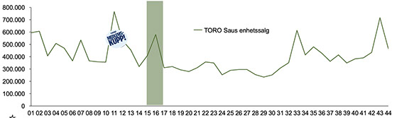 TORO saus - salgsutvikling i vinter & Påske Kilde: NIQ | Enhetssalg | TORO Saus | Norge total| uke 1-44 2025